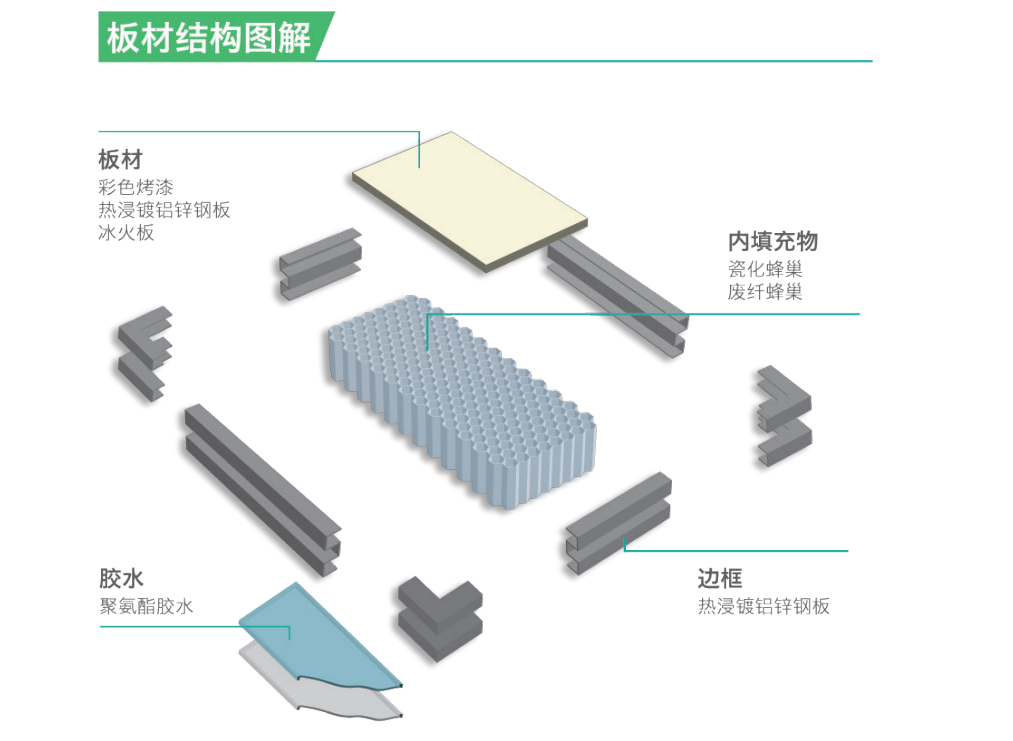 产品是由蜂巢与钢板和铝板复合而成,蜂巢通过无数个六边形网络构成无数个密封的小空间,具有自重 轻、保温隔音性能好的特点,可回收再利用,属于绿色环保建材;同时蜂巢经我司技术创新工艺,具备防 火、防水、防潮功能,填补了国内外蜂巢板的技术空白;边框采用公母槽镀锌龙骨,省去中字铝连接, 安装方便快捷,有效降低了安装成本;面板间隙为自然缝,大同面积平整度好,线条明快整齐,体现简 单明了的风格;产品适用于办公大楼、酒店、机场、医院、工业厂房、洁净室等墙体领域。●自重轻,仅10kg/m²